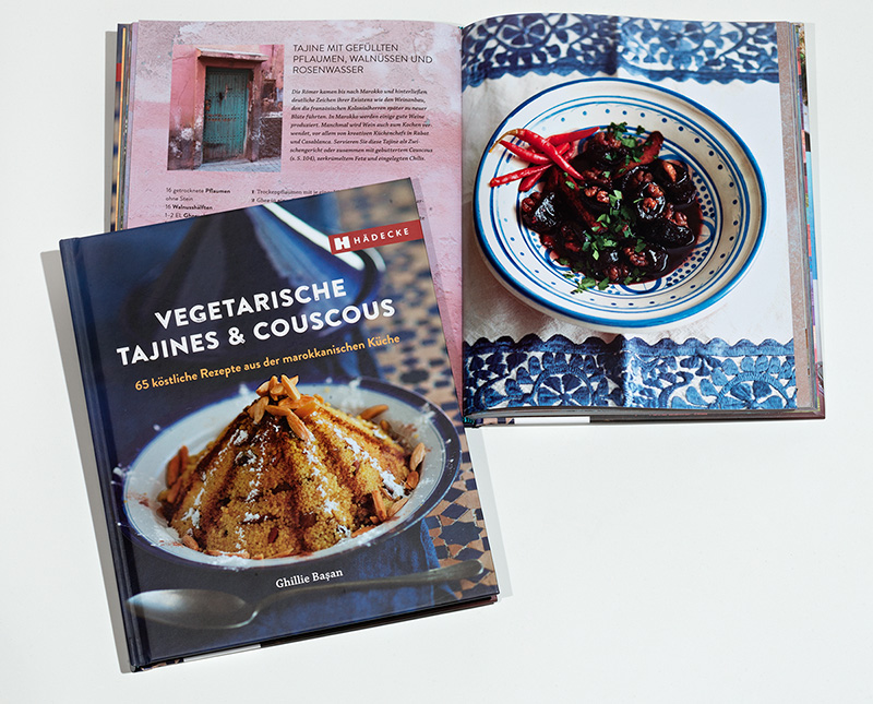 Tajines nennen sich aber auch die langsam garenden Eintöpfe, die in diesen Kochgeräten zubereitet werden. In ihrem Buch “Vegetarische Tajines und Couscous” stellt Ghillie Basan zahlreiche fleischlose Varianten vor, die keine langen Garzeiten benötigen und deshalb ohne großen Aufwand und ohne großen Abwasch zubereitet sind. Auch im normalen Schmortopf, denn die wenigsten von uns werden eine Tajine daheim haben.