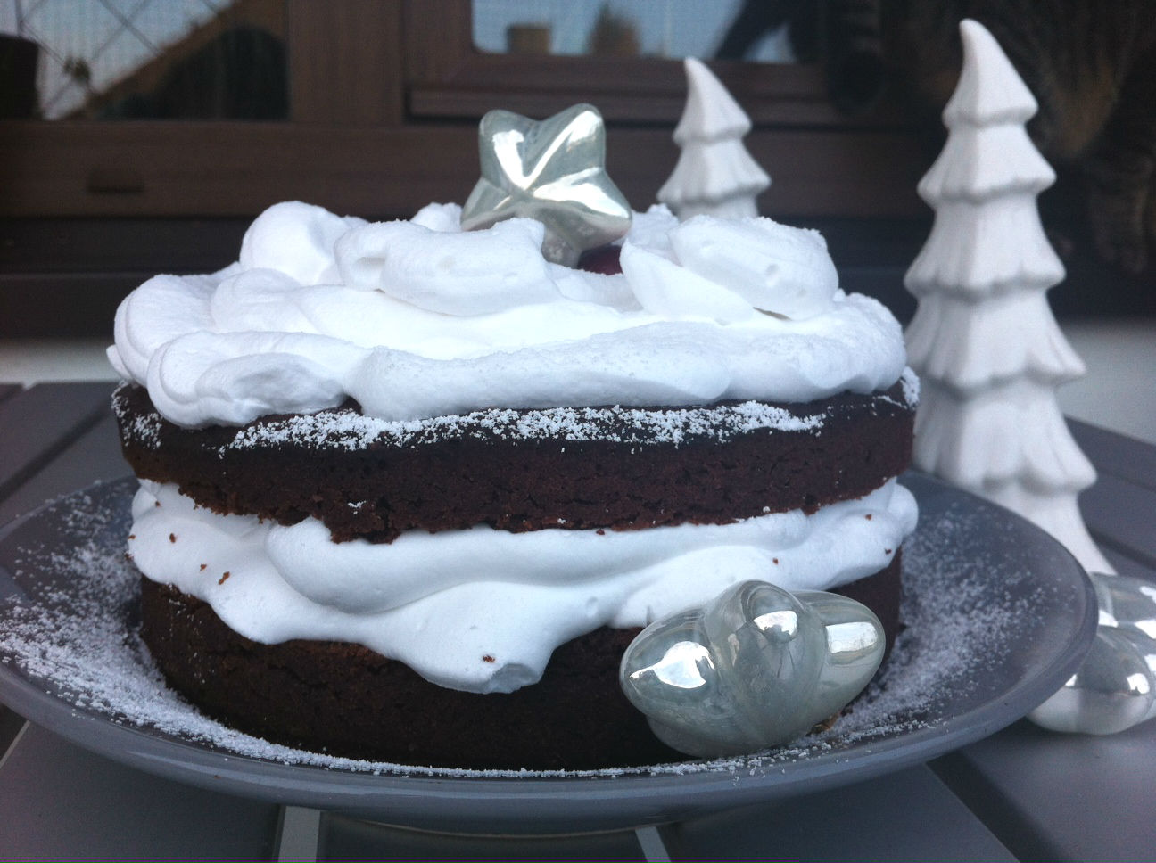 Das Törtchen jetzt kühl stellen und mindestens über Nacht durchziehen lassen, damit sich die Aromen (der Schnaps!) gut mischen können. Vor dem Servieren mit Puderzucker bestäuben (Schneegestöber).
