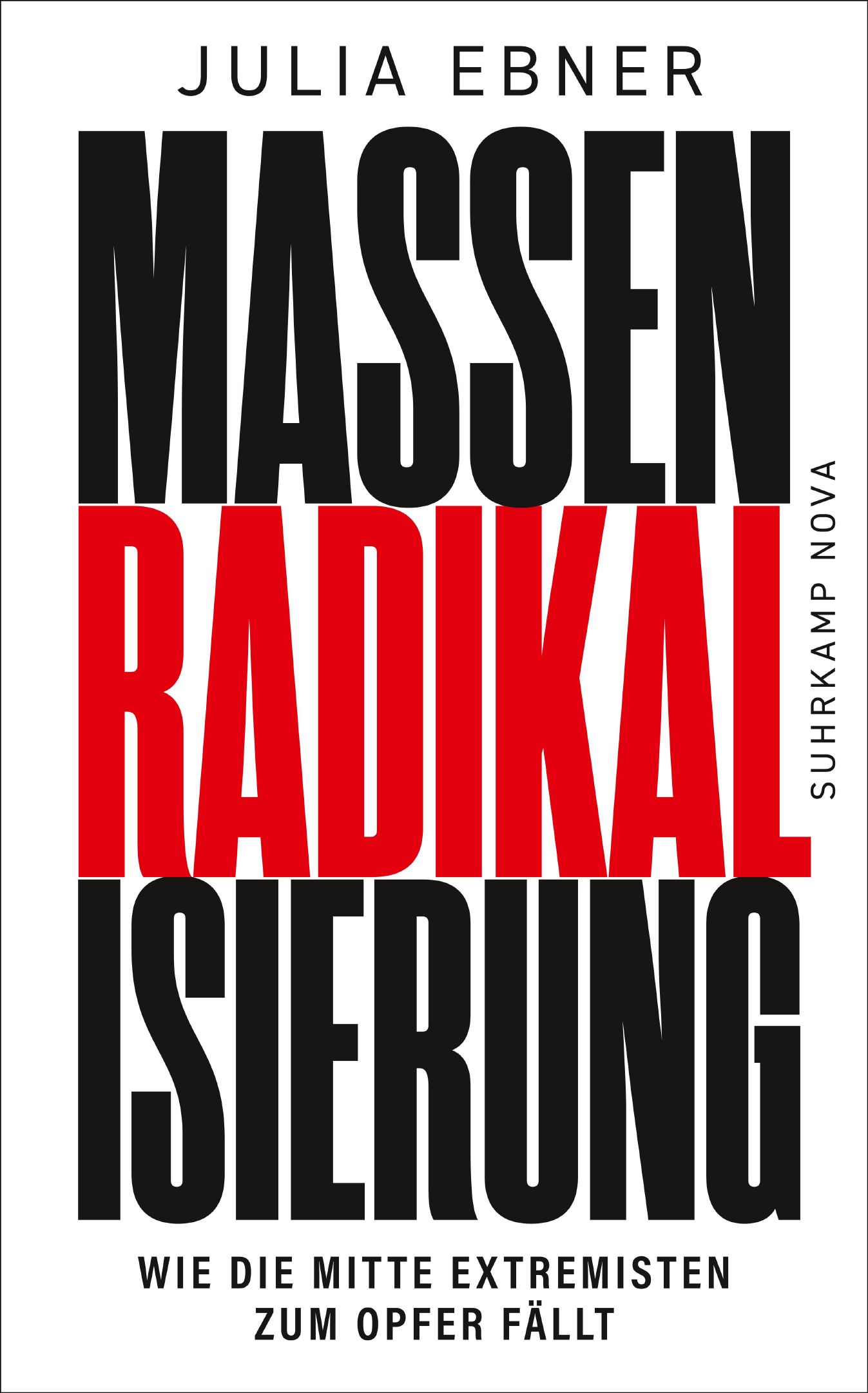 Buchinfo: Massenradikalisierung von Julia Ebner, erschienen bei Suhrkamp Nova, 13.03.2023, 360 Seiten, gebunden, ISBN 978-3-518-47314-6, € 20,00. Radikalisierungsmaschinen von Julia Ebner, erschienen bei Suhrkamp Nova, 2019, 356 Seiten, Broschur, ISBN 978-3-518-47133-3, € 12,00