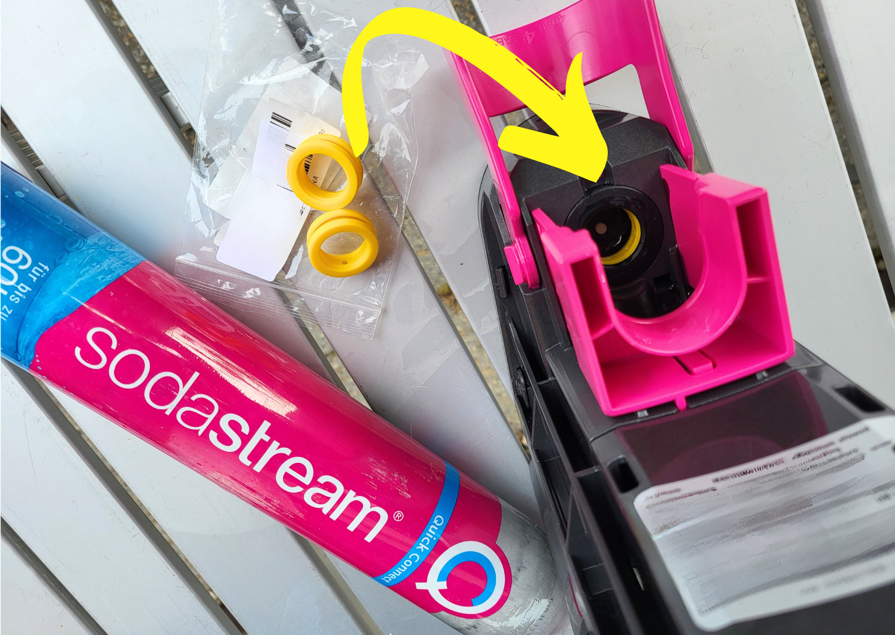 Nach Anruf beim Hersteller wusste ich: Funktioniert höchstwahrscheinlich nicht mehr, weil die gelbe Dichtung oben, wo das Ventil der Gaskartusche rein kommt, eine ganz kleine Vorwölbung nach innen (zur Soda-Kartusche hin) hat.